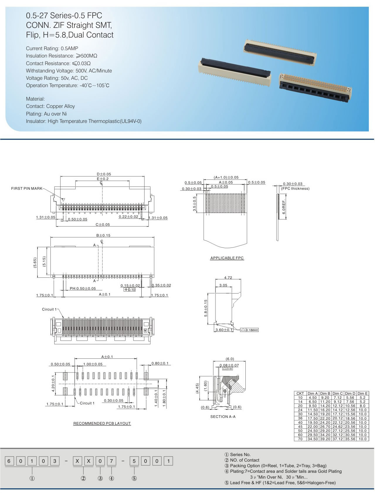 0.5-27 Series-0.5 FPC CONN. ZIF Straight SMT,Flip, H=5.8,Dual Contact Current Rating: 0.5AMP lnsulation Resistance:≥500MΩ Contact Resistance: ≤0.03Ω Withstanding Voltage:500V,AC/Minute Voltage Rating: 50v, AC, DC Operation Temperature: -40℃-105℃ Material: Contact: Copper Alloy Plating: Au over Ni Insulator:High Temperature Thermoplastic(UL94V-O)