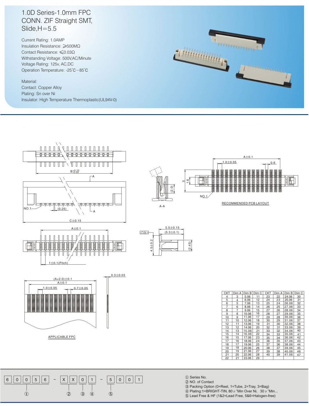CONN.ZIF Straight SMT,Slide,H=5.5
