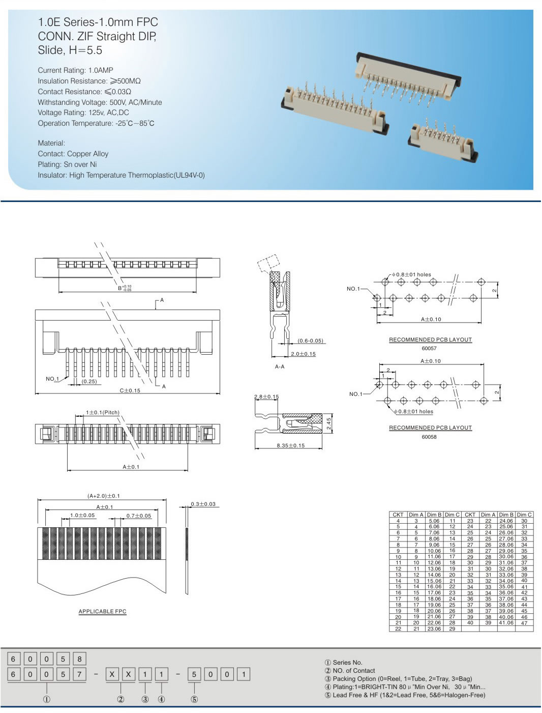 1.0-09 Series-1.0mm FPC CONN.ZIF R/A SMT, Flip, H=2.0,Dual Bottom Contact Current Rating: 1.0AMP Insulation Resistance:≥500MΩ Contact Resistance: ≤0.03Ω Withstanding Voltage:500V,AC/Minute Voltage Rating:50v,AC, DC Operation Temperature:-25℃-85℃ Material: Contact: Copper Alloy Plating: Sn over Ni lnsulator: High Temperature Thermoplastic(UL94V-O)