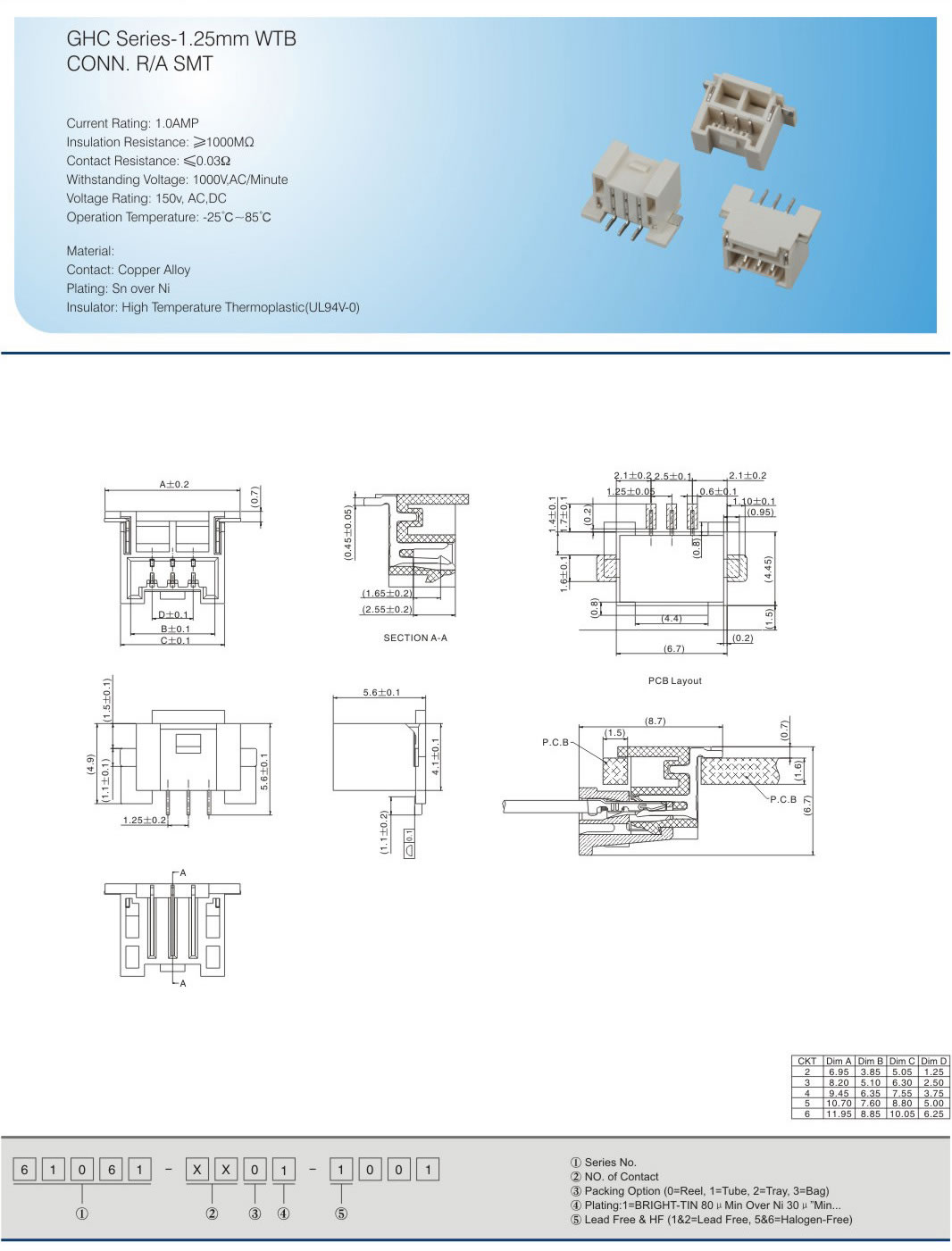 GHC Series-1.25mm WTB CONN.R/A SMT Current Rating: 1.0AMP Insulation Resistance:≥100OMΩ Contact Resistance:≤0.03Ω Withstanding Voltage: 10OOV,AC/Minute Voltage Rating: 150v,AC,DC Operation Temperature:-25℃-85℃ Material: Contact: Copper Alloy Plating: Sn over Ni Insulator: High Temperature Thermoplastic(UL94V-O)