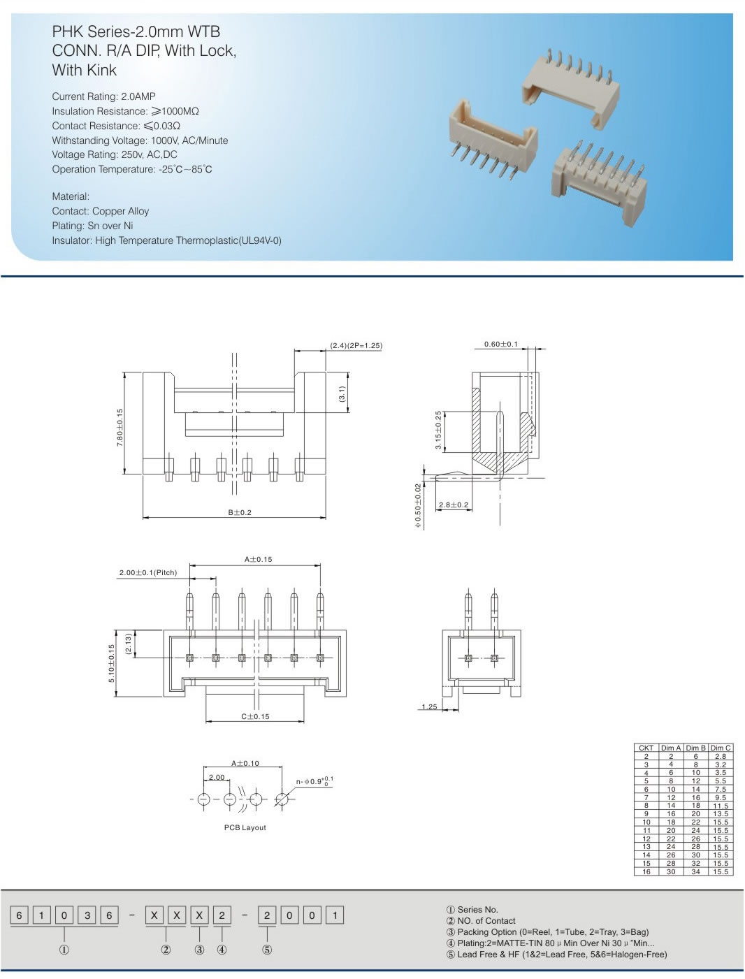 PHK Series-2.0mm WTB CONN.Straight DIP, With Kink Current Rating: 2.0AMP Insulation Resistance: ≥1000MΩ Contact Resistance:≤0.01Ω Withstanding Voltage:800V, AC/Minute Voltage Rating: 100v,AC,DC Operation Temperature:-25°℃-85℃ Material: Contact: Copper Alloy Plating: Sn over Ni Insulator: High Temperature Thermoplastic(UL94v-O)