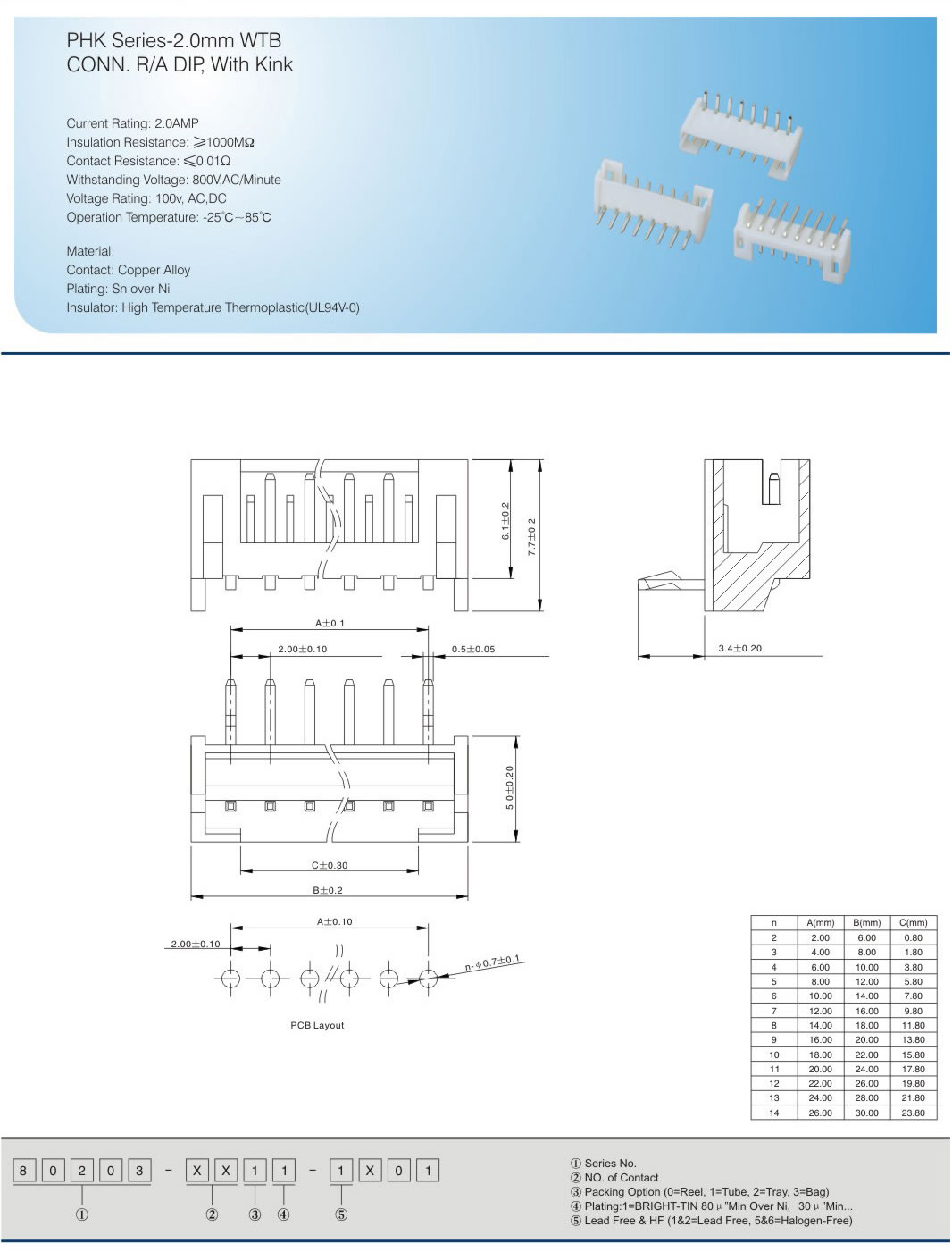 PHK Series-2.0mm WTB CONN. R/A DIP, With Kink Current Rating: 2.OAMP Insulation Resistance:≥1000MΩ Contact Resistance:≤0.01Ω Withstanding Voltage: 800V,AC/Minute Voltage Rating: 100v,AC,DC Operation Temperature:-25C-85℃ Material: Contact: Copper Alloy Plating: Sn over Ni Insulator: High Temperature Thermoplastic(UL94V-O)
