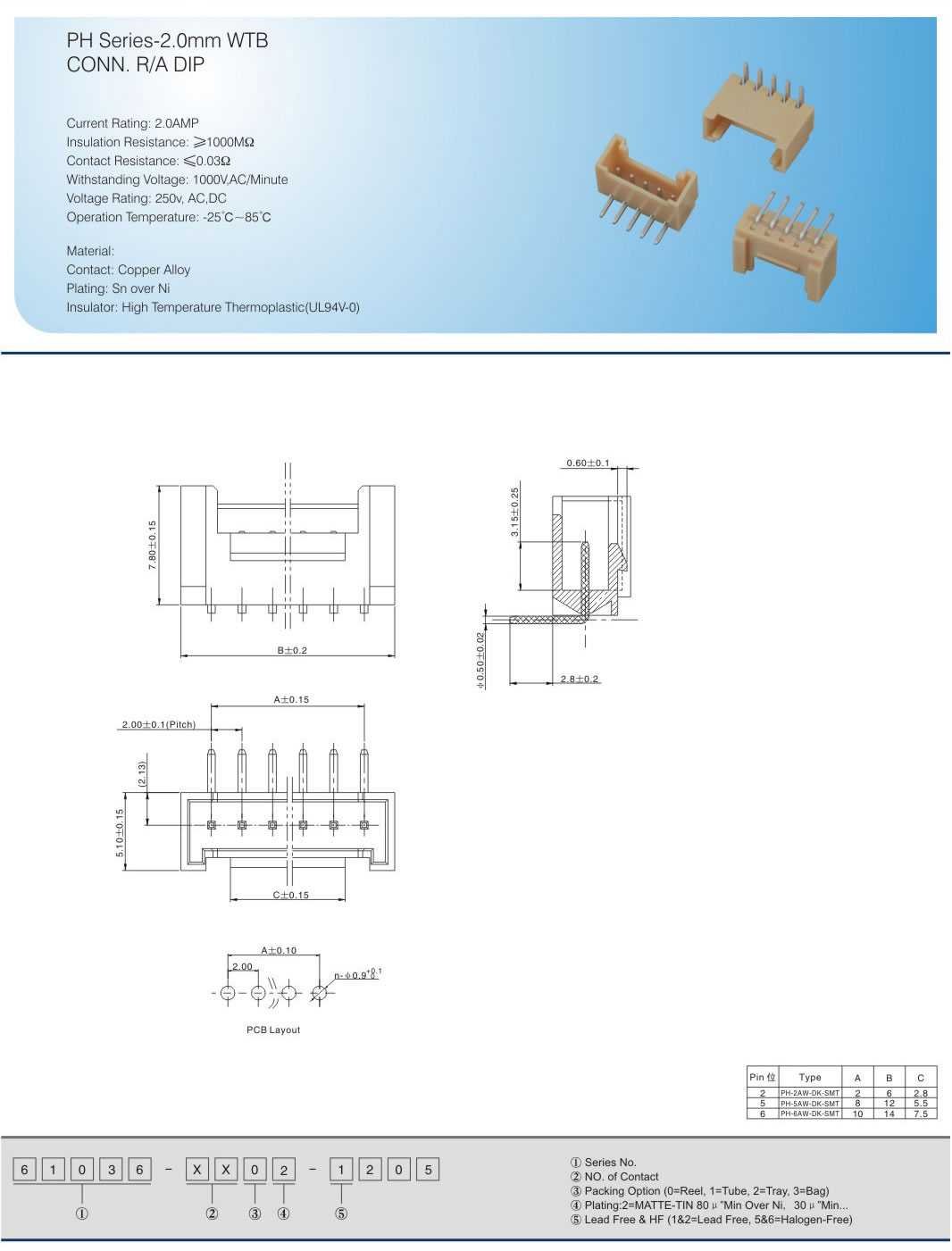 PH Series-2.0mm WTB CONN.R/A DIP Current Rating: 2.OAMP Insulation Resistance:≥100OMΩ Contact Resistance:≤0.03Ω Withstanding Voltage:10OOV,AC/Minute Voltage Rating: 250v, AC,DC Operation Temperature:-25C-85℃ Material: Contact: Copper Alloy Plating: Sn over Ni Insulator: High Temperature Thermoplastic(UL94v-0)