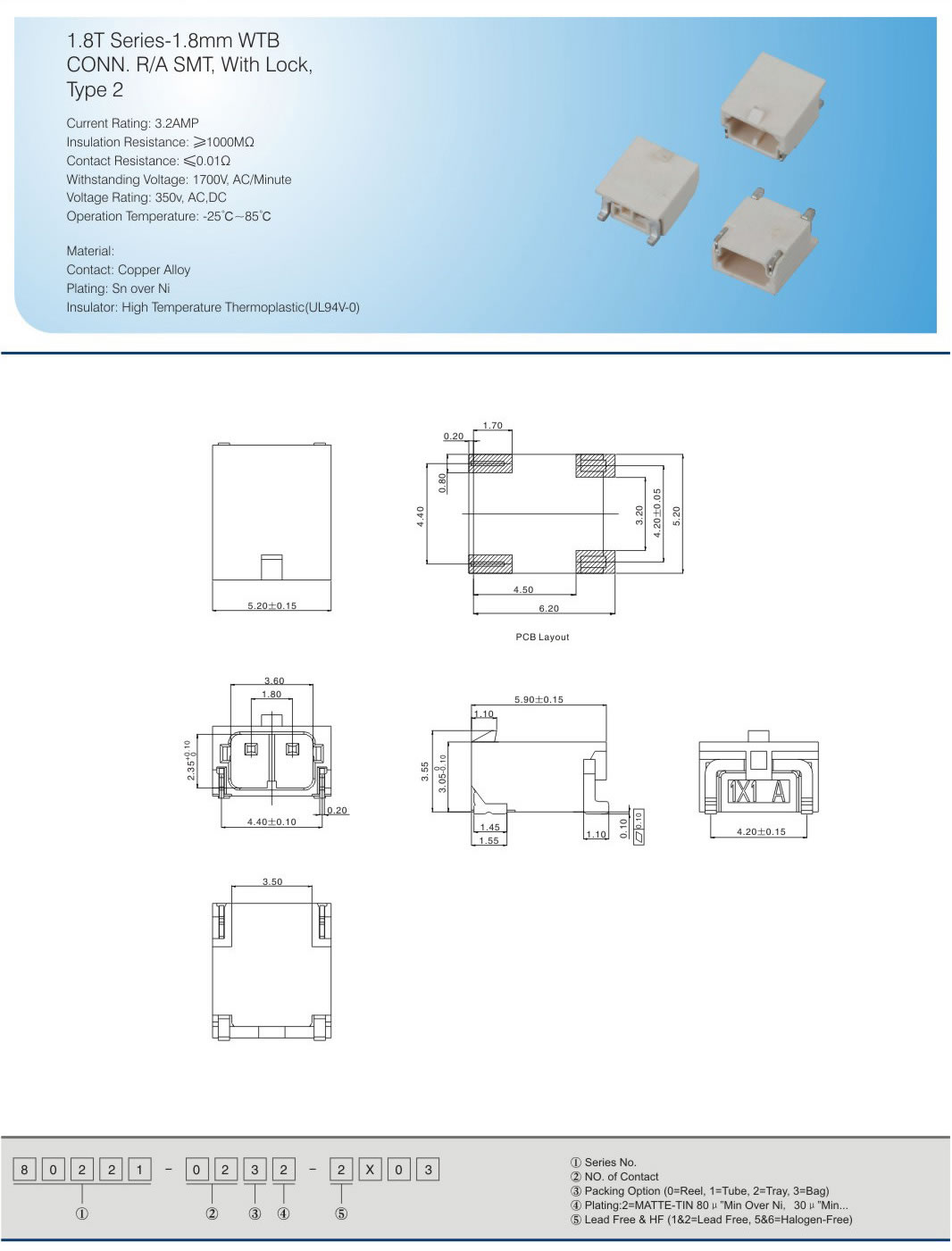 1.8T Series-1.8mm WTB CONN. R/A SMT, With Lock, Type 2 Current Rating: 3.2AMP Insulation Resistance:≥1000MΩ Contact Resistance:≤0.01Ω Withstanding Voltage: 170OV,AC/Minute Voltage Rating:35Ov,AC,DC Operation Temperature:-25℃-85℃ Material: Contact: Copper Alloy Plating: Sn over Ni Insulator: High Temperature Thermoplastic(UL94V-O)