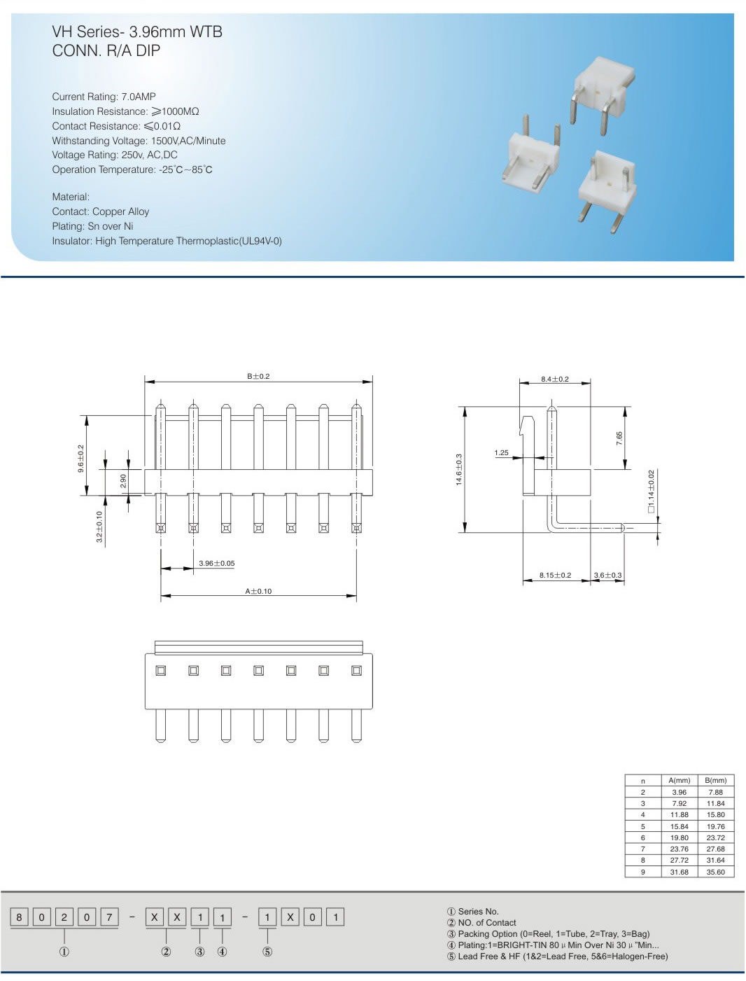 VH Series- 3.96mm WTB CONN. R/A DIP Current Rating: 7.0AMP Insulation Resistance:≥1000MΩ Contact Resistance:≤0.01Ω Withstanding Voltage: 1500V,AC/Minute Voltage Rating:250v,AC,DC Operation Temperature:-25℃-85℃ Material: Contact: Copper Alloy Plating: Sn over Ni Insulator: High Temperature Thermoplastic(UL94V-O)