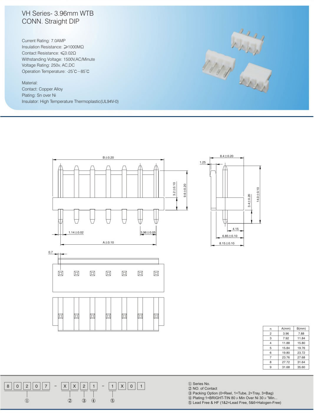 VH Series- 3.96mm WTB CONN.Straight DIP Current Rating: 7.0AMP Insulation Resistance: ≥1000MΩ Contact Resistance:≤0.02Ω Withstanding Voltage: 1500V,AC/Minute Voltage Rating: 250v, AC,DC Operation Temperature:-25'℃-85℃ Material: Contact: Copper Alloy Plating: Sn over Ni Insulator: High Temperature Thermoplastic(UL94V-O)