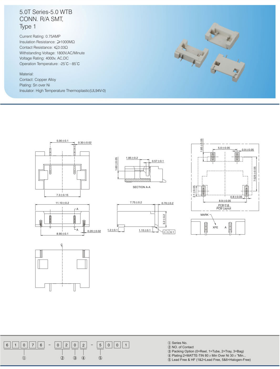 5.0T Series-5.0 WTB CONN.R/A SMT, Type 1 Current Rating: 0.75AMP lnsulation Resistance:≥1000MΩ Contact Resistance:≤0.03Ω Withstanding Voltage: 180OV,AC/Minute Voltage Rating: 400Ov,AC,DC Operation Temperature:-25°℃-85℃ Material: Contact: Copper Alloy Plating: Sn over Ni lInsulator:High Temperature Thermoplastic(UL94v-O)