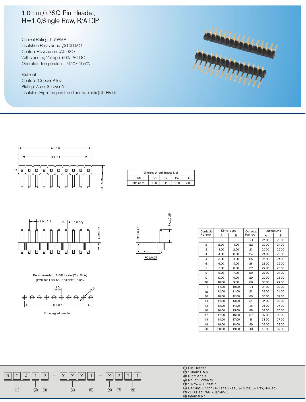 1.Omm,0.3SQ Pin Header, H=1.0,Single Row, R/A DIP Current Rating: 0.75AMP Insulation Resistance:≥1000MΩ Contad Resistance: ≤0.03Ω Withstanding Voltage:50Ov, AC,DC Operation Temperature:40℃~105℃ Matarial: Contad: Copper Alloy Plating: Au or Sn over Ni Insulator: High Temperature ThermoplastiqUL94V-O)
