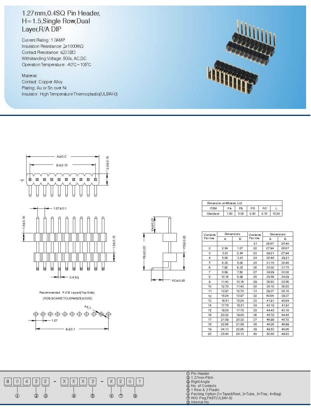 1.27mm,0.4SQ Pin Header, H=1.5,Single Row,Dual Layer,R/A DIP Current Rating: 1.0AMP Insulation Resistance: ≥1000MΩ Contad Resistance:≤0.02Ω Withstanding Voltage:500, AC,DC Operation Temperature:40℃~105℃ Matarial: Contad: Coppe Alloy Plating: Au or Sn over Ni Insulator: High Temperature ThermoplasticUL94V-0)