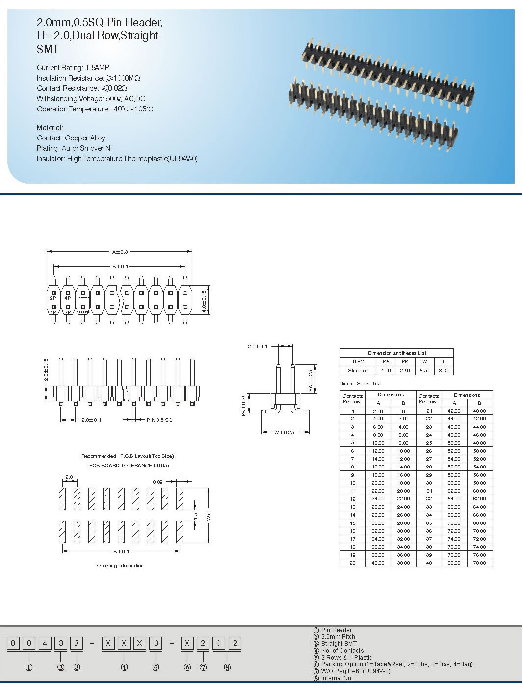 2.0mm,0.5SQ Pin Header, H=2.0,Dual Row,Straight SMT Current Rating: 1.5AMP Insulation Resistance.≥1000MΩ Contad Resistance: ≤0.02Ω Withstanding Voltage:50Os, AC,DC Operation Temperature:40℃~105℃ Material: Contad: Copper Alloy Plating: Au or Sn over Ni lnsulator: High Temperature Thermoplastic(UL94V-O)