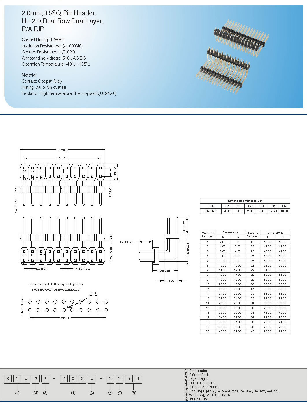 2.0mm,0.5SQ Pin Header, H=2.0,Dual Row,Dual Layer, R/A DIP Current Rating: 1.5AMP Insulation Resistance. ≥1000MΩ Contad Resistance:≤ 0.02Ω Withstanding Voltage:50Os, AC,DC Operation Temperature: 40℃~105℃ Material: Contad: Copper Alloy Plating: Au or Sn over Ni Insulator : High Temperature Thermoplastid(UL94V-0)