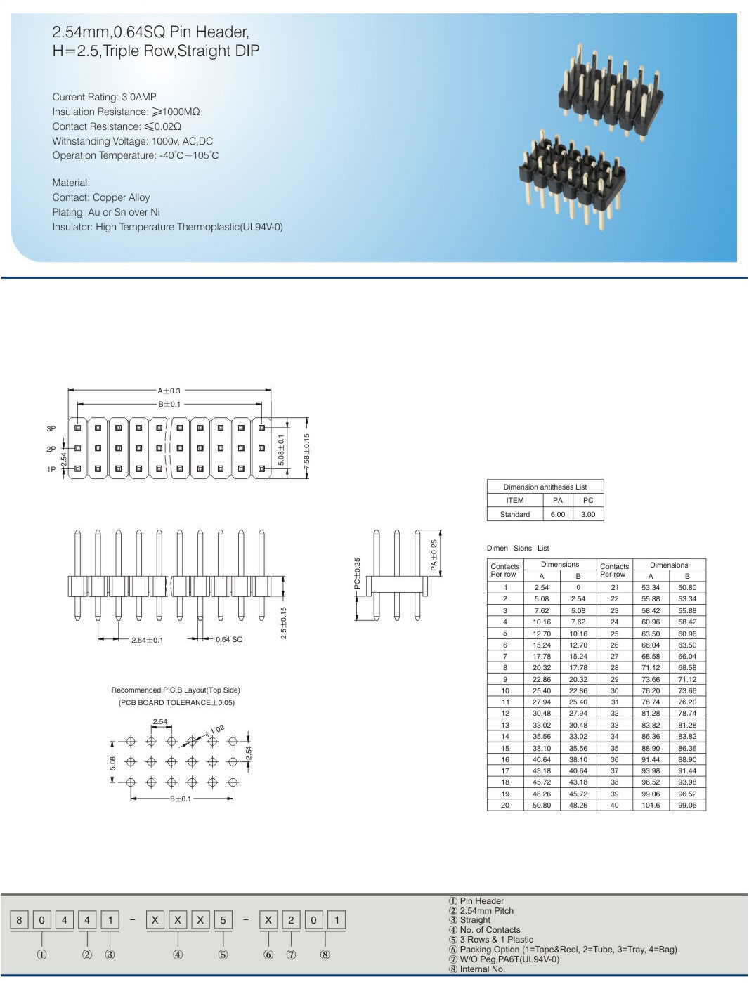 2.54mm,0.64SQ Pin Header, H=2.5, Triple Row,Straight DIP Current Rating: 3.0AMP Insulation Resistance:≥1000MΩ Contact Resistance:≤0.02Ω Withstanding Voltage: 100Ov, AC,DC Operation Temperature: -40C-105℃ Material: Contact: Copper Alloy Plating: Au or Sn over Ni Insulator: High Temperature Thermoplastic(UL94v-0)