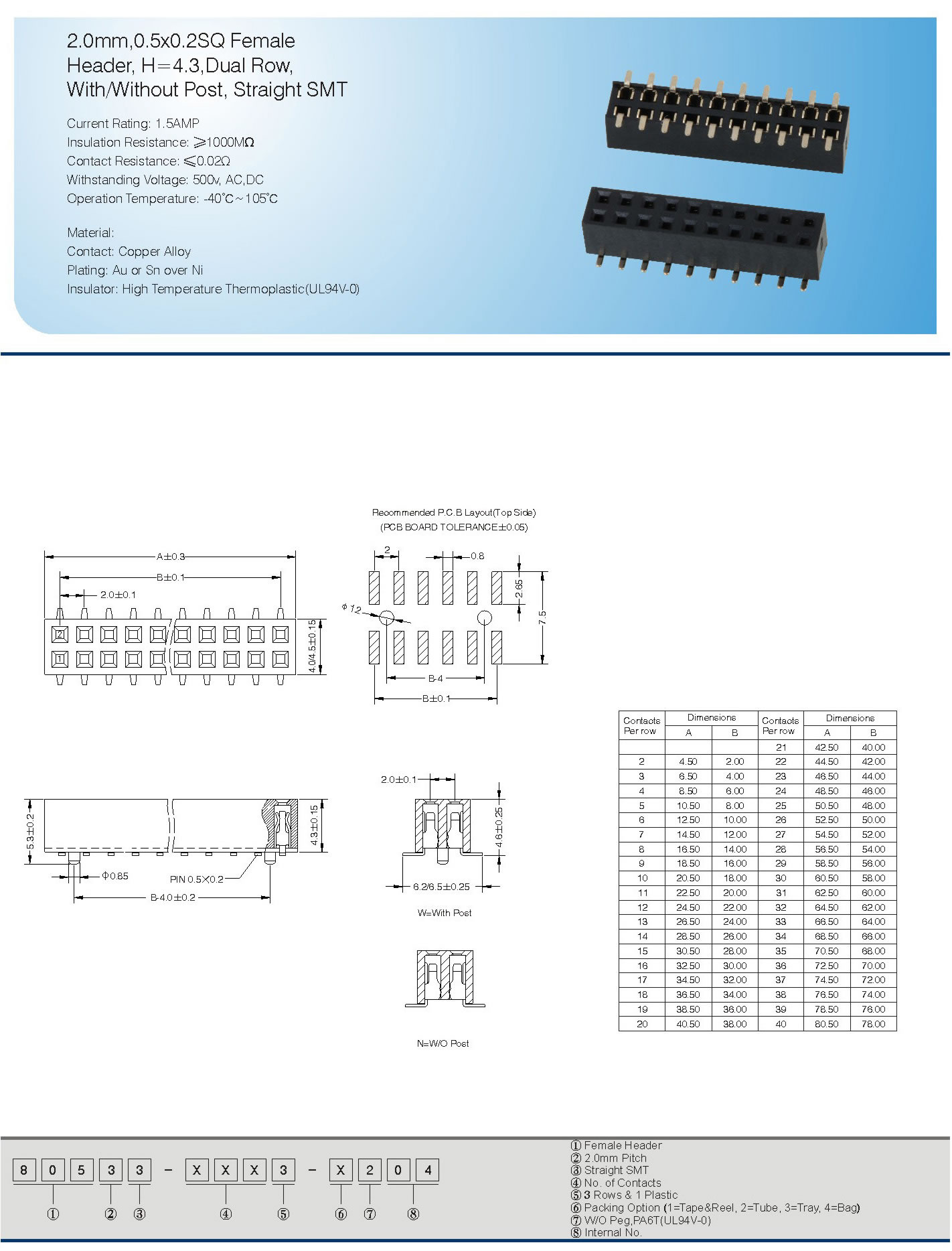 2.Omm,0.5x0.2SQ Female Header, H=4.3,Dual Row, WithWithout Post, Straight SMT Current Rating: 1.5AMP Insulation Resistance:≥100OMΩ Contact Resistance: ≤0.02Ω Withstanding Voltage: 500v, AC,DC Operation Temperature: -40℃~105℃ Material: Contact: Copper Alloy Plating: Au or Sn over Ni Insulator: High Temperature Thermoplastic(UL94V-O)