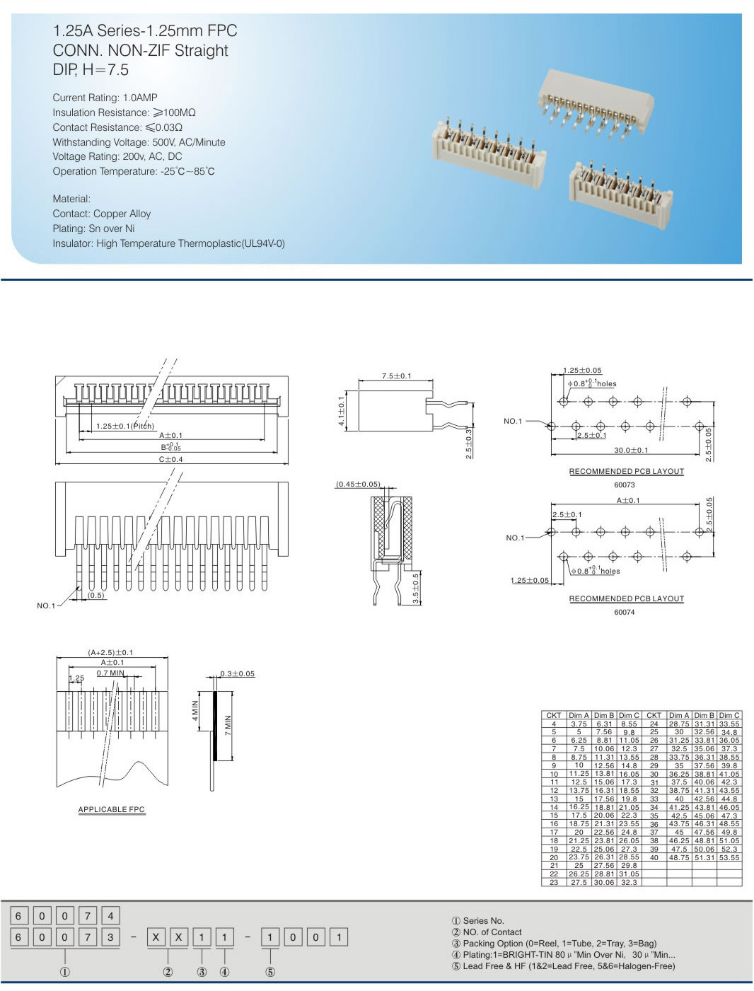 1.25A Series-1.25mm FPCCONN. NON-ZIF StraightDIP, H=7.5